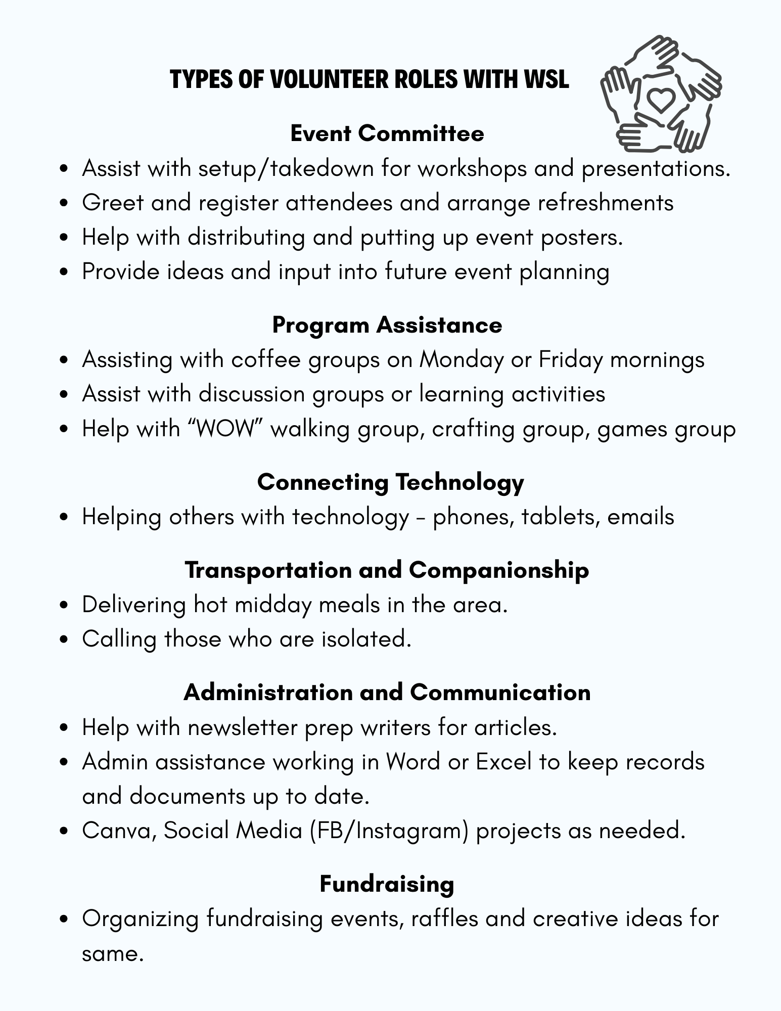 WSL is managed and run by volunteers, and there are opportunities to get involved in various committees such as Finance, Marketing and Communication, Membership, Programs, and Volunteer Services. These committees meet monthly for one to two hours, with additional time required for assigned tasks. The Board, consisting of different positions, is also open to members interested in contributing their managerial, financial, marketing, communications, or technology skills.